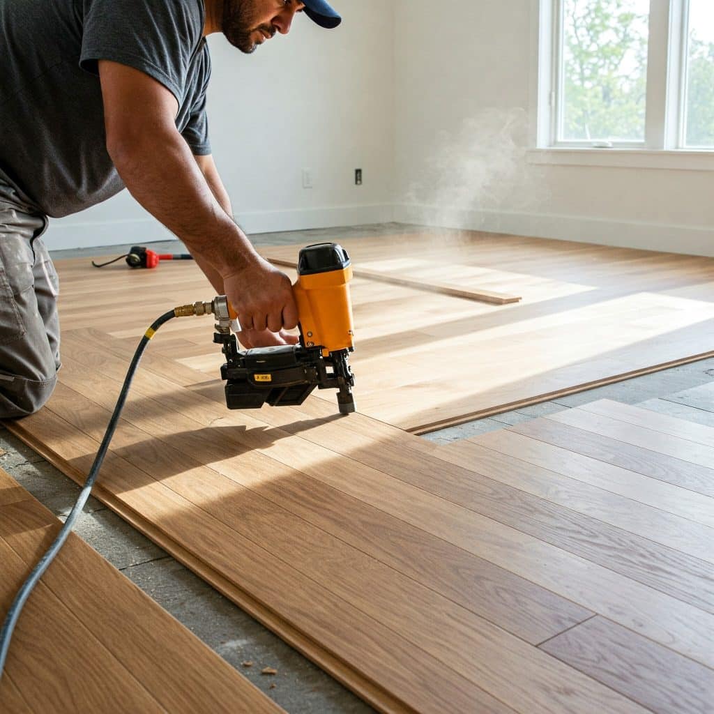 - Professional hardwood floor laying and nailing process near Near North Side